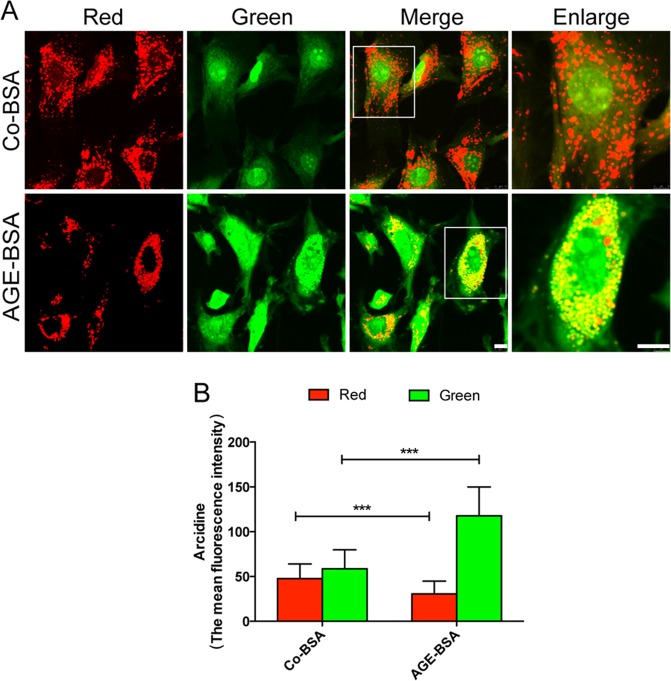 Previous studies have shown that lysosomal membrane permeabilization (LMP) is a main cause of lysosomal dysfunction in renal tubular epithelial cells when exposed to AGE-BSA or urinary proteins28,29. Accordingly, we tested LMP by acridine orange (AO) redistribution. AO is a kind of lysomotropic metachromatic fluorescent dye that emits red fluorescence within lysosomes and green fluorescence in the cytosol. As shown in Fig. 9, numerous red granules were observed in the Co-BSA group, indicating AO located in the lysosomes and that the lysosomal membrane is integrated. However, concomitant with the increase of green fluorescence, a conspicuous reduction of red fluorescence was observed after the cells were treated with AGE-BSA, suggesting AO was released from lysosomes and redistributed in the cytoplasm. This indicated that AGEs triggered impaired lysosomal membrane integrity and LMP, since AO that is released from the lysosomes into the cytosol emits an enhanced green fluorescence in the cytoplasm.