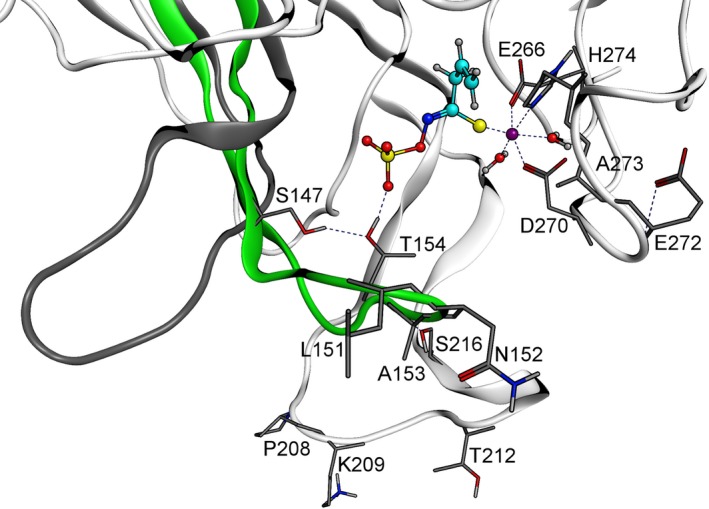 Alternative 3L2 loop conformation of TaTFP with docked allylglucosinolate aglucone and Fe2+. The 3L2 loop conformation identified in this study is colored in green, the previously known conformation is depicted in dark grey. Amino acids of the 3L2 (144–166), 4L2 (204–218), and 5L2 (269–283) loops (Gumz et al., 2015), which directly interact with Fe2+ or the aglucone or indirectly affect the binding site in the newly established conformation are depicted with sticks. Allylglucosinolate aglucone and Fe2+ are highlighted as spheres (Fe2+ purple, oxygen red, sulfur yellow, nitrogen blue, C‐skeleton cyan).
