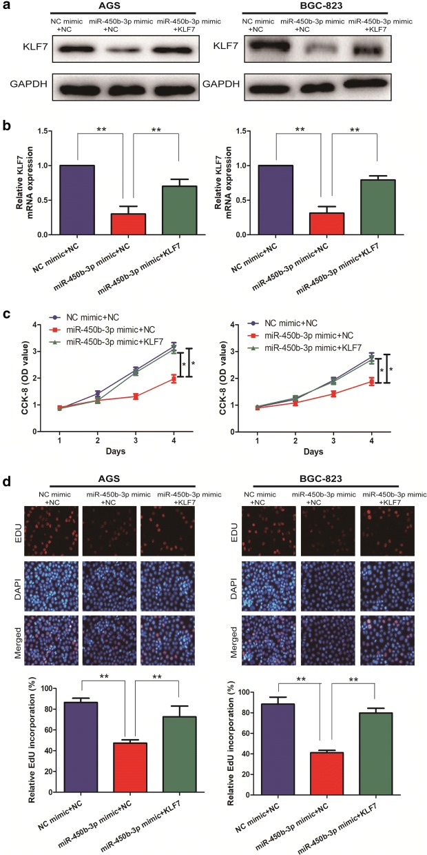 miR-450b-3p regulated the expression of KLF7 in GC cell lines. a The expression level of KLF7 in the co-transfected GC cell lines of miR-450b-3p and KLF7 was detected by Western Blotting; b The expression level of KLF7 in the co-transfected GC cell lines of miR-450b-3p and KLF7 was detected by qRT-PCR; c CCK-8 assay detected the cell proliferation in the co-transfected GC cell lines of miR-450b-3p and KLF7; d EdU assay was used to detect cell invasion and migration of GC cell lines after co-transfection of miR-450b-3p and KLF7 (Magnification: ×40). Data are mean ± SD, *p < 0.05, **p < 0.01
