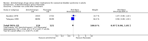 No evidence of a difference was found in the subjective cure rates after treatment in two trials included in the meta‐analysis (Gaudenz 1978; Takayasu 1990) (RR 0.97; 95% CI 0.90 to 1.05 comparison 05.02); or in the subjective improvement rate (RR 1.01; 95% CI 0.46 to 2.22 comparison 05.04). There was evidence of heterogeniety between trials for the latter comparison. The participants in these two studies differed: one study (Gaudenz 1978) had exclusively female participants in a European population and the other study (Takayasu 1990) included both male and female participants drawn from a Japanese population. Based upon one small trial (Gaudenz 1978) there was no evidence of a difference in the number with nocturia after treatment (RR 0.96; 95% CI 0.66 to 1.39 comparison 05.06). Two trials reported results of symptomatic assessment favouring the use of flavoxate (Herbst 1970; Stanton 1973). It is worth noting that these trials favouring flavoxate were published in the early 1970s. Four trials (Gaudenz 1978; Meyhoff 1981; Riva 1989; Wehnert 1989) reported that there were no statistically significant differences between flavoxate and anticholinergic drugs. Gaudenz 1978 found more patients preferred flavoxate although objective assessment with urodynamics was equivocal. Milani 1993 et al found flavoxate was the preferred drug. Two crossover trials (Cardozo 1979; Milani 1993) reported favourable results for anticholinergics.