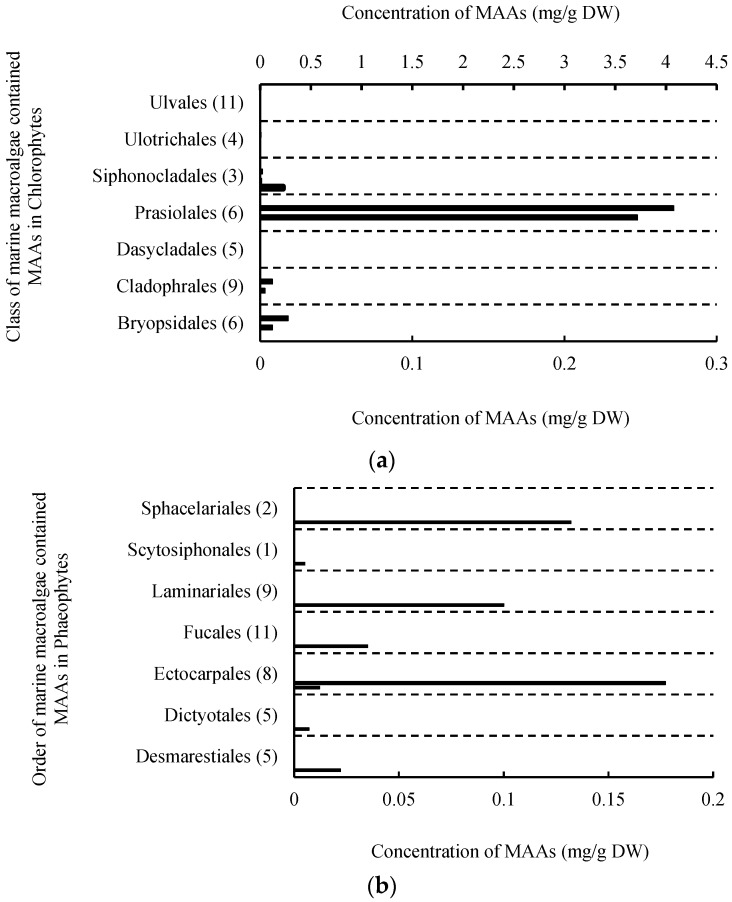 The research efforts made pertaining to MAAs in marine macroalgae have drawn signifficant attention since 1990. The contents and composition of MAAs in marine macroalgae were important in developing MAAs. Therefore, the summary and analysis of total MAAs contents and MAAs composition in marine macroalgae have been conducted according to different orders in this paper (Figure 2, Figure 3 and Figure 4).