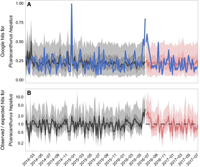 Google search frequency: a relative frequency of searches for P. hepatus (blue line) and counterfactual posterior predictive distribution based on similar species (shaded band). Black band represents the time period the counterfactual model was fit to and the red band represents the forecasted posterior predictive distribution after the release of the Dory movie. b Ratio of observed search frequency (blue line in a) to expected search frequency (shaded band in a) where values greater than 1 represent a higher than expected search frequency. Black/red lines and dark and light shaded regions represent median, 50%, and 90% credible intervals, respectively