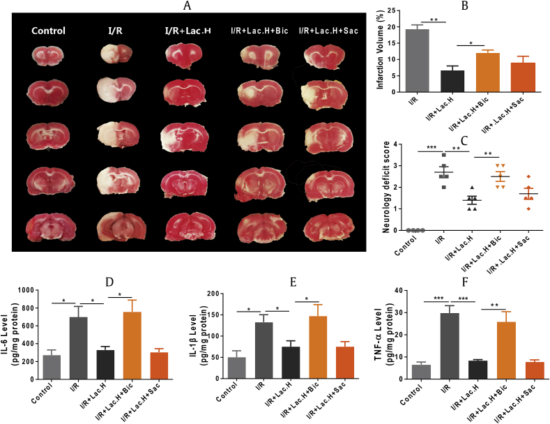 Lac.H was cultured and colonized in rats by intragastrically administrating 1 × 109 CFU of Lac.H once per day for 15 consecutive days, and then neuroprotective effects of Lac.H were evaluated. As shown in Figs. 4A–4C, Lac.H colonization greatly reduced the volume of infarcts caused by I/R surgery, and the increase in neurological deficit score caused by I/R surgery was significantly attenuated by colonization with Lac.H (p < 0.001). The levels of IL-1β, IL-6, and TNF-α in the I/R group were significantly downregulated by Lac.H (Figs. 4D–4F).