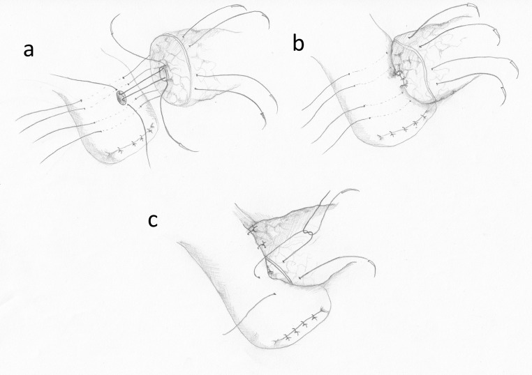 The prototype of duct-to-mucosa anastomosis, still performed in many surgical centers, was proposed in 1956 by Cattell and Warren [34]. Initially, the tissues surrounding about 2 cm of the pancreatic stump are removed. Subsequently, single interrupted monofilament 4–0 sutures are placed through the posterior part of the pancreatic capsule (parallel to the axis of the pancreas, 1 cm from the cut edge) and through the seromuscular layer of the intestine. After 8–10 sutures are completed, they are carefully tied, forming the external layer of the posterior wall of the anastomosis (Fig. 3a). Then, the intestine is opened by electrocautery exactly in opposite position to the MPD. The cut should be of identical size as the MPD. Depending on the MPD diameter, 6–12 single interrupted monofilament 5–0 sutures are placed between the wall of the MPD (often including a part of the surrounding pancreatic tissue) and through the full wall of intestinal opening (Fig. 3b). Tying is performed from the back of the MPD towards the front. Finally, the external anterior layer of the anastomosis is performed with monofilament 4–0 single interrupted sutures between the pancreatic capsule and the seromuscular layer of the intestine (Fig. 3c) [34].