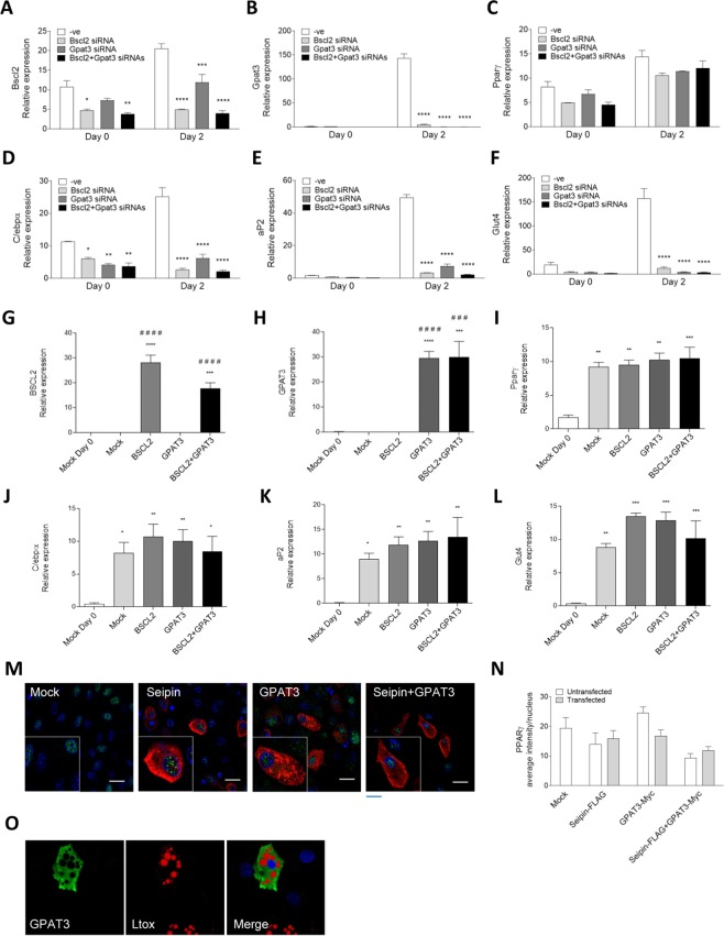 Inhibition of Gpat3 expression fails to rescue adipogenesis in seipin-deficient cells, while GPAT3 overexpression does not impair this process. C3H10T1/2 cells were transfected with control siRNA (−ve) or siRNA targeting seipin (Bscl2), Gpat3 or both seipin (Bscl2) and Gpat3 as indicated at day -2 and day 0 of differentiation. RNA was extracted at day 0 or day 2 of differentiation and expression of Bscl2/seipin (A) Gpat3 (B) Pparγ (C) C/ebpα (D) aP2 (E) and Glut4 (F) was determined by qPCR. Data are presented as relative mRNA expression (means ± SEM, n = 4), normalized to the stable housekeeping gene Ywhaz. Statistically significant differences compared to control siRNA at each time point are indicated: * indicates p < 0.5, **p < 0.01, ***p < 0.001, ****p < 0.0001. Alternatively, cells were transfected at day -2 and day 0 of differentiation with empty vector or plasmids encoding seipin (BSCL2), GPAT3, or co-transfected with both seipin (BSCL2) and GPAT3, as indicated. RNA was isolated at day 0 or day 2 of differentiation and expression of BSCL2/seipin (G), GPAT3 (H), Pparγ (I), C/ebpα (J), aP2 (K) and Glut4 (L) determined by qPCR. Data are presented as means ± SEM, (n = 4), normalized to Ywhaz. Statistical analysis was made by one-way ANOVA followed by Dunnett’s multiple comparison post-hoc test. Statistically significant differences compared to control day 0 (Mock Day 0) are indicated by *p < 0.05, **p < 0.01, ***p < 0.001, ****p < 0.0001. Statistically significant differences compared to control (Mock day 2) samples are indicated by ###p < 0.001, ####p < 0.0001. (M) Identically transfected cells were also differentiated for 3 days, fixed and immunostained to detect FLAG-seipin/BSCL2 (red) or Myc-GPAT3 (red), anti-PPARγ (green) and DAPI for nuclei (blue). Co-transfected cells were immunostained for myc-GPAT3. (N) Quantified PPARγ signal intensity in the nuclei of untransfected and transfected cells in 50 nuclei per group in two independent experiments. Scale bar, 20 µm. Data represent means ± SEM. (O) Representative image of C3H10T1/2 overexpressing GPAT3 fixed at day 5 of differentiation and immunostained with antibodies to Myc-GPAT3 (green) and LipidTox to visualize lipid droplets.