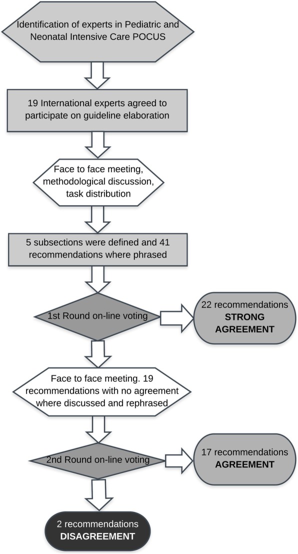 A total of 41 recommendations on the use of POCUS in neonatal and paediatric critical care were discussed. There was strong agreement on 22 recommendations after first-round voting. Following the discussion in an in-person meeting among the experts (organised within the 2018 ESPNIC congress (Paris, France)), 19 recommendations were re-worded and re-voted in the second round (Fig. 1). There was agreement on 17 recommendations and disagreement on 2 recommendations as summarised in Table 1 and discussed below.