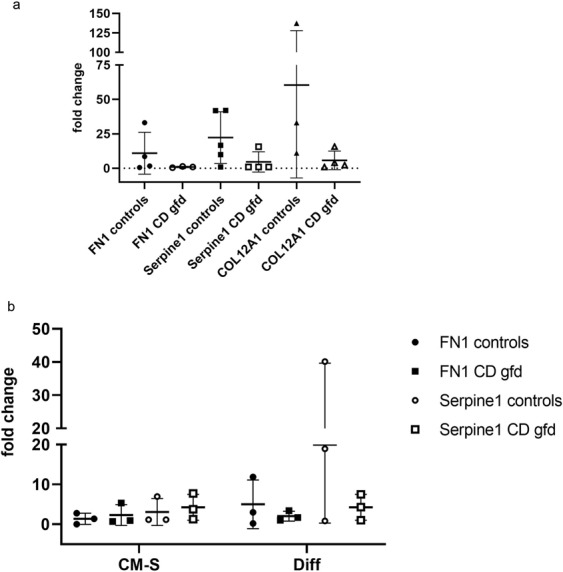 Relative mRNA expression of organoids from healthy controls compared to organoids from patients with CD on gfd. Scatter dot blot; line at mean with SD. Real-time PCR was performed for expression of FN1, SERPINE1, and COL12A1, and fold-change analysis was done with ΔΔCt method. GAPDH was used for housekeeping gene and values correlated to basic expression of sample from CD patient on gfd. (a) Organoids derived from duodenal biopsies of healthy controls (n = 3–5) showed clearly higher expression of FN1, SERPINE1, and COL12A1 than samples from patients with CD on gfd (n = 3–5). Single data are missing caused by low cDNA concentrations. (b) No different gene expression was noticed in non-differentiated organoids cultured in CM-S. Differentiation for two days resulted in increased levels of FN1 and SERPINE1 in organoids from controls (n = 3) compared to CD gfd (n = 3).