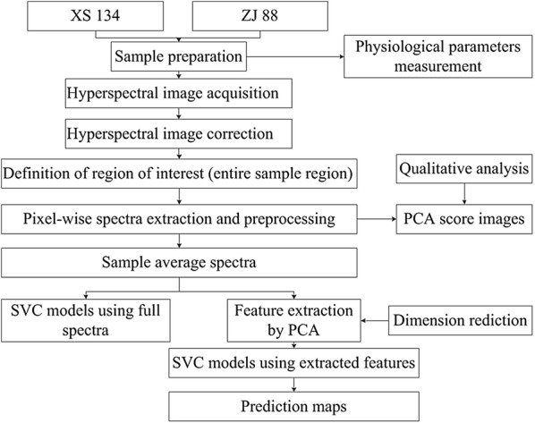 The prime aim of the present study was to evaluate the feasibility of using ground-based HSI for the separability of quinclorac toxicity and the alleviation function of SA in rice seedlings. The specific objectives were: (1) comparison of spectral variations of leaves under normal and quinclorac stress, and stress alleviation by SA; (2) establishment of detection models and visualization of leaves under different treatments; and (3) investigation of impact of rice varieties Xiushui 134 (XS 134) and Zhejing 88 (ZJ 88) on detection performance. The general workflow of this study is shown in Fig. 1.