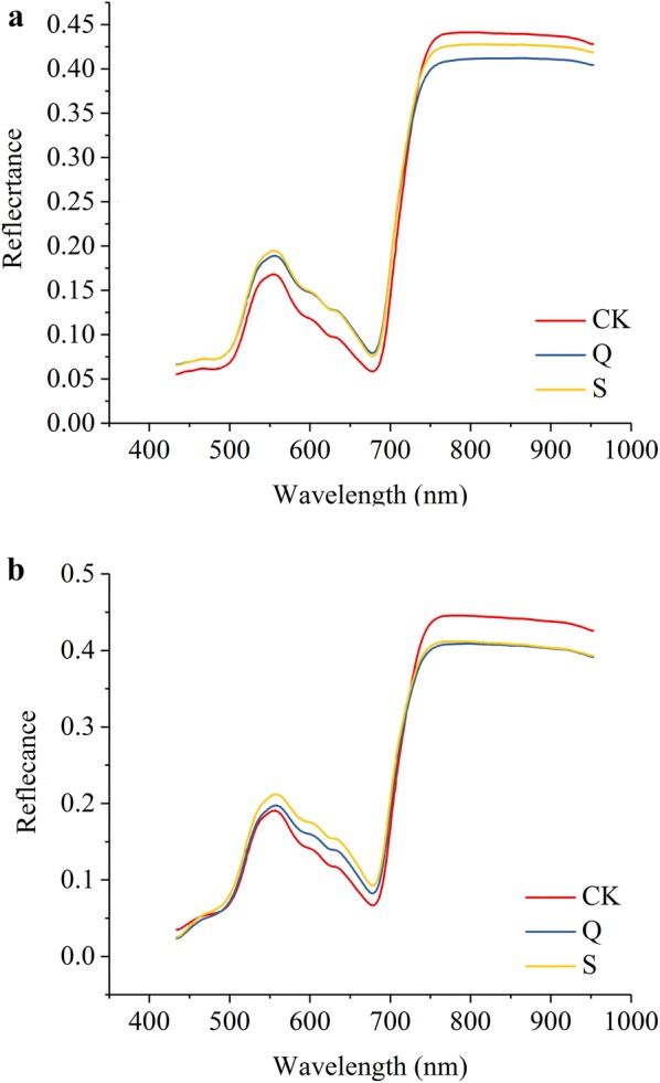 Average spectra of the three groups of XS 134 (a) and ZJ 88 (b). CK: treated with nutrient solution; Q: treated with 0.25 g/L quinclorac, S: pre-treated with 10 mg/L SA under 0.25 g/L quinclorac stress