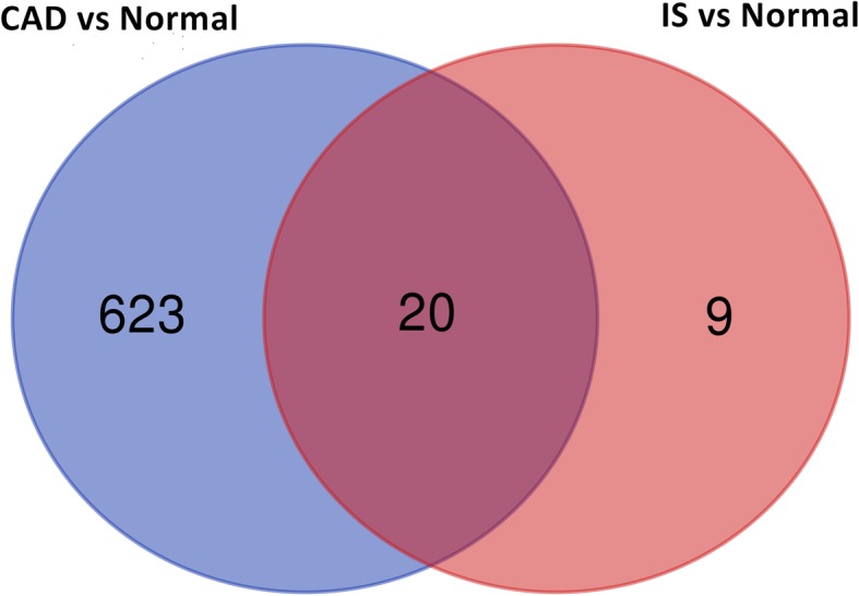 Venn map showing the intersection of DEGs between CAD vs normal and IS vs normal