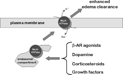 Signaling pathways resulting in recruitment of Na,K-ATPase molecules from intracellular pools to the basolateral membrane of the alveolar epithelium enhance Na,K-ATPase function and thus alveolar edema clearance and might represent new therapeutic approaches in acute lung injury. In particular, β-adrenergic receptor (β-AR) agonists, dopamine, mineralo- and glucocorticosteroids and growth factors have been implicated