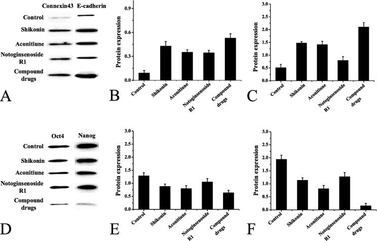 As shown in Fig. 6, the expression of connexin43 and E-cadherin protein in the lungs of the model group mice was very low, indicating that the proliferation and differentiation ability of the cells was decreased, and the adhesion ability between cells was decreased, as shown in Fig. 6A, B, and C. And the expression of tumor stem cell markers Oct4 and Nanog in the lungs of the model group mice increased. After drug treatment, the expression of connexin43 and E-cadherin protein in the lungs of mice in each treatment group increased, and the expression levels of Oct4 and Nanog decreased. As shown in Fig. 6D, E, and F.