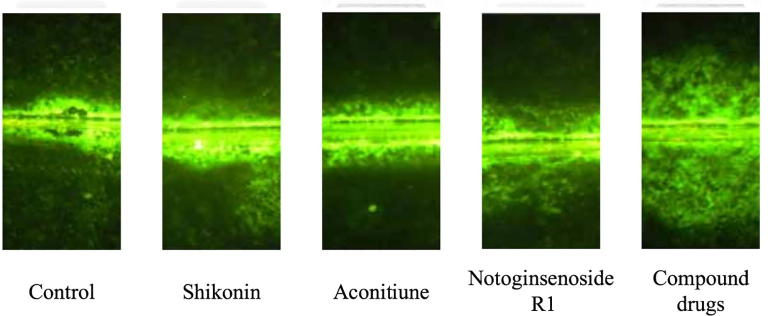 MLE-12 cells in logarithmic growth phase were selected, digested with 0.25% trypsin, and stopped when the cells were detached from the wall of the culture vessel. The cell concentration was calculated and the number of cells was diluted to 2 × 105/mL, 2 mL of cells were inoculated per well on the well plate. After that, the plate was incubated in a cell incubator with 5% CO2 at 37 °C and the drug was added as it grows to saturation. The final concentration of the drug was 10 μM of urethane, 0.2 μM of shikonin, 0.02 μM of aconitine, 2 μM of notoginsenoside R1 and the combination of three drugs, 3 replicate wells were set for each well, continued to culture for 48 h. The PBS was heated to 37 °C, the cells were washed three times in succession, and the pre-warmed 0.05% fluorescent yellow PBS dye was added, 2 mL per well. A scalpel with thin blade was used to pierce the cell layer and lightly scratch it. After 3 min, the fluorescent yellow dye was discarded. The cells were washed twice with PBS, and the number of fluorescence transfer layers between the cells was observed under a microscope. There were two scratches in the cell layer of each well., 10 wells were observed and recorded according to the random principle. The number of cell layers passed from the scratch side to the adjacent cells was scored according to the fluorescence: 0 point for the cells where fluorescence was limited to the single layer of cells adjacent to the scratch; 1 point for the cells where the fluorescence was transmitted from the cell to the side of the adjacent 1–2 layers of scratch; 2 point for the cells where the fluorescence was transmitted from the cell to the side of the adjacent 2–3 layers of scratch; 3 point for the cells where the fluorescence was transmitted from the cell to the side of the adjacent 4 layers or more of scratch.