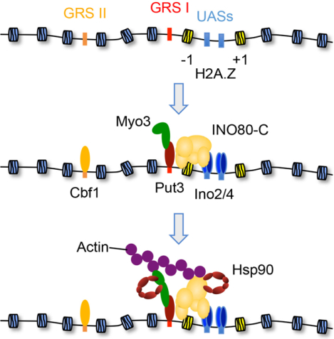 In conjunction with recent DNA repair studies, it is evident that myosin motors are used to mobilize select chromatin sites in reaction to physiological cues (Caridi et al., 2018; Figure 5B). While a combination of Mre11, HP1a, and Smc5/6 are used to recruit myosins to double-stranded DNA breaks (Caridi et al., 2018), how a motor is targeted to a gene promoter was not evident. However, prior work had identified the Put3 and Cbf1 transcription factors as critical determinants in transitioning INO1 to the nuclear periphery, as these proteins bind to proximal DNA elements termed Gene Recruitment Sequences I and II, respectively, or “DNA zip codes” (D’Urso et al., 2016; Brickner et al., 2012; Ahmed et al., 2010). We speculated that these factors might direct Myo3 to the INO1 locus.