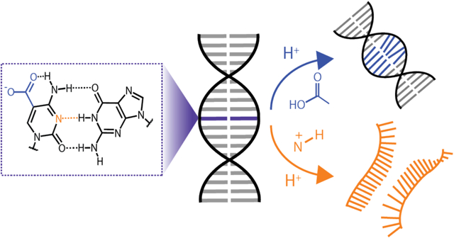 The physical and biological properties of DNA are highly sensitive to environmental factors such as temperature,1–4 counterions,5 and pH.6–9 In particular, pH effects can greatly impact nucleic acids through direct protonation or de-protonation of specific nucleobase sites, leading to changes in secondary structure6, 10–11 and duplex dissociation.7, 12–13 Proton concentrations across different intracellular compartments are highly regulated and vary substantially from pH 8.0 in mitochondria to pH 7.2 in the nucleus to pH 4.7 in lysosomes.14 Different local environments regulate DNA properties and can potentially lead to damage. Even before the determination of DNA’s double helical structure,15 it had been shown that polymeric DNA dissociates under alkaline and acidic conditions.8 Since then, many details related to the identities of protonated species,6–7, 16–18 conformational changes,7, 16 and their thermodynamic impact on duplex DNA (dsDNA) have been investigated.7, 13, 19 It has been demonstrated that the thermal melting temperature of DNA is greatly reduced under acidic conditions and largely stems from perturbations to G:C base pairing.6, 17–18, 20 As a result, the degree of protonation tolerated in dsDNA and its thermodynamic impact is highly-dependent on the level of G:C content.