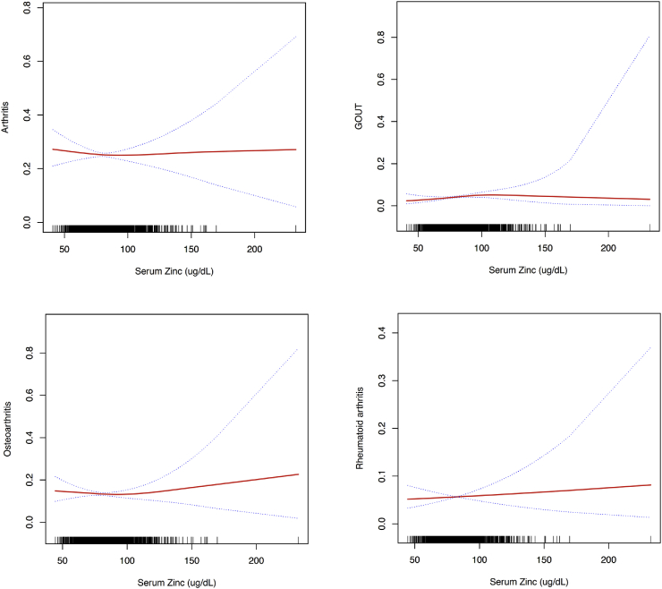 Therefore, investigating the impact of serum zinc concentrations on major health outcomes can provide additional insights for device design and clinical transformation of zinc-based biomaterials. Based on the National Health and Nutrition Examination Survey (NHANES, 2011-2014), our study mainly evaluated the associations between serum zinc levels and major human diseases such as fractures, cardiovascular diseases, stroke, arthritis, diabetes mellitus, thyroid diseases, and cancer and indicators of major outcomes such as bone mineral density, blood glucose, and blood lipids. We also aimed to ascertain the presence of non-linear correlations between serum zinc concentrations and the above-mentioned diseases and outcomes indicators and to explore possible threshold effects.