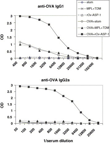 Mean amounts of anti-OVA IgG1 and IgG2a in mouse sera (n = 5 per group) after immunization with OVA formulated with alum, MPL + TDM or the test rOv-ASP-1 adjuvant. Antibody amounts are expressed as optical densities (OD) in the ELISA assays. The reciprocal dilutions of serum are indicated on the x axis. For control purposes, mice were also immunized with the adjuvants alone. The same symbols apply in both graphs.