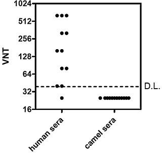 We tested the adenovirus neutralization activity of sera from camels [4] and humans from Qatar (healthy individuals). All procedures were performed in compliance with relevant laws and institutional guidelines. Briefly, adenovirus expressing green fluorescent protein (GFP) (400 PFU) was premixed 1:1 with serial dilutions of sera prior to inoculation onto A549 cells, and viral infection was monitored by the detection of GFP-positive cells after 48 h. VNTs were determined as the highest serum dilution that showed a 50% reduction in the number of adenovirus-infected cells.