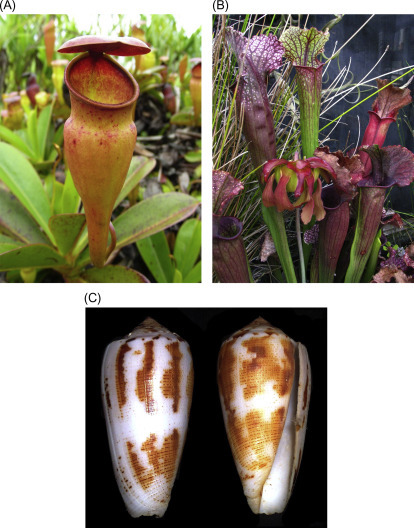 (A) Photograph of a species of Nepenthes, one of the pitcher plants, a plant with antifungal properties and medicinal value that were recently ascertained by scientists. (B) Photograph of a species of Sarracenia, another pitcher plant (distantly related to the Nepenthes in (A)); this is the source of sarapin, a compound of medicinal value. The close relatives of this species produce similar active compounds. (C) Photograph of Conus magus, the cone snail; neurotoxins that are naturally produced by this snail for paralyzing and capturing prey have been found to have uses in medicine as pain killers.