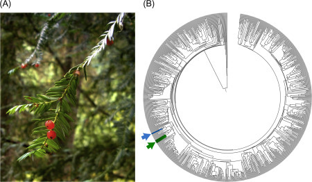 (A) The Pacific Yew, Taxus brevifolia, the original source of the cancer-treating drug Taxol. This species is rare, however. Using a tree of relationships, a close relative of this species from Europe (a species that is common) became the commercial source of Taxol until the drug was ultimately produced synthetically. (B) Chemical compounds of possible medical use to humans are often localized or clustered on the plant Tree of Life—these are “medicinal hotspots.” Two such hotspots are shown here (in blue and green) in this circle tree of relationships of the flowering plants. Tree modified here to show useful chemistry of Solanaceae (tomato family) and Apocynaceae (dogbane or milkweed family).