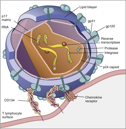 Structure of FIV. An FIV virion is shown adjacent to the surface of a CD4+ T cell. Lentiviruses contain two identical strands of RNA (the viral genome) and associated enzymes, which include reverse transcriptase, integrase, and protease, packaged into a core composed of the p24 capsid protein with a surrounding p17 protein matrix, all enclosed by a phospholipid membrane envelope that is derived from the host cell. Viral encoded membrane proteins (gp41 and gp120) are bound to the envelope. CD134 and CXCR4 (chemokine) receptors on the host cell surface function as the receptors for FIV.