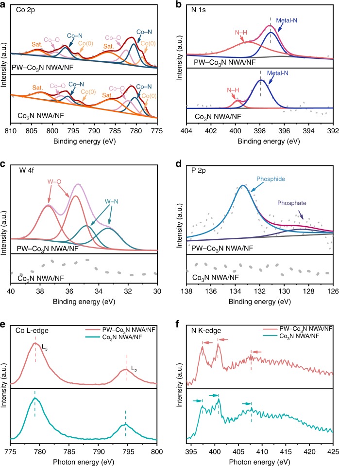 In order to get insight on the chemical states and further confirm the P/W doping, the comparing investigation of X-ray photoelectron spectroscopy (XPS) characterization on Co3N NWA/NF and PW-Co3N NWA/NF are performed. Their XPS survey spectra (Supplementary Fig. 7) notably indicate the existence of P and W signals besides Co and N, further confirming the successful doping. The high-resolution spectrum of Co 2p in PW-Co3N NWA/NF (Fig. 2a) possesses two peaks at 780.6 and 796.9 eV, respectively, which can be assigned to Co-N bond in Co3N phase10,26–29. Importantly, these two peaks are positively shifted to higher binding energies in PW-Co3N NWA/NF. Specifically, the deconvoluted peaks at 778.6 and 793.9 eV can be assigned to metallic Co states in Co3N30,31 while the peaks at 786.9 and 803.7 eV can be attributed to satellite peaks29,32. Two more peaks located at 782.4 and 799.2 eV could be originated from the surface oxidation, which has also been broadly observed33,34. The high-resolution N 1s spectrum (Fig. 2b) can be deconvoluted to metal-N (397.1 eV) and N–H (399.1 eV) peaks, respectively, which further confirm the formation of nitride35,36. Interestingly, the binding energy of metal-N displays a negative shift after P/W doping, which is consistent to the positive shift of Co peaks. The W 4f (Fig. 2c) and P 2p (Fig. 2d) spectra can be fitted into W-N (33.3 and 34.8 eV) and P–Co bonds (129.1 eV)37, respectively, besides the peaks at 35.6, 37.5, and 133.4 eV originated from the surface oxidation37,38. These XPS results suggest that the doping of P and W could induce the charge redistribution, and doping could drive the interfacial charge transfer from doped P/W and Co to N, which leads to the peak shift of Co and N8,10,39. In order to further confirm this phenomenon, the synchrotron-based X-ray absorption near edge structure (XANES) Co L-edge and N K-edge spectra for PW-Co3N NWA/NF and Co3N NWA/N are further collected, as shown in Fig. 2e, f, respectively. It can be observed that two typical L3 and L2 peaks of Co L-edge at about 779.3 and 794.9 eV exhibit a positive shift after P/W doping40, while those of N K-edge spectra show negative shift accordingly41, which further reveals the possibly existed interfacial charge transfer effect upon doping observed in XPS results.