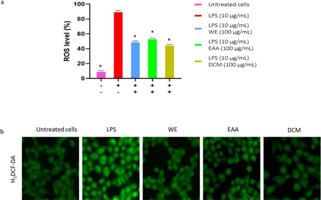 Effective inhibition of LPS-induced ROS production by S. sisymbriifolium extracts in macrophage cells (a). Statistical analysis: one-way ANOVA with Duncan multiple range test for means ± SD separation where *P < 0.05 was considered to indicate statistically significant difference compared to the LPS-treated group. (b) Images of the effects of LPS-induced ROS production by extracts imaged by confocal microscope using the H2DCFDA dye.