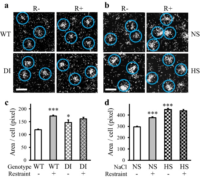NUCB2 mRNA expressing cells were clearly visible in the emulsion-coated sections (Fig. 4a, b). The signal intensities were higher in hypernatremic animals (WT vs. DI: p < 0.05, NS vs. HS: p < 0.001), and in the restraint stressed groups (WT vs. WT-R and NS vs. NS-R: p < 0.001) compared to normal controls. Prior chronic osmotic stress inhibited the NUCB2 responses to restraint in both models (Fig. 4c, d).