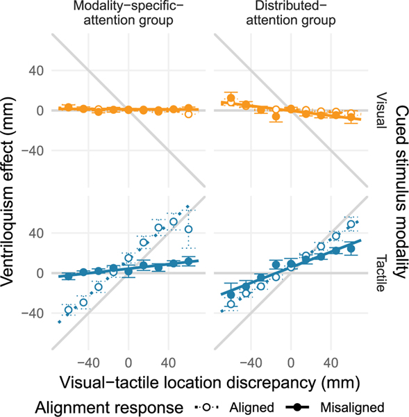 Trials in which the alignment response indicated that the participant had misperceived the number of stimuli were excluded from all analyses (6.6% of trials; raw data are available at https://osf.io/epcqv/?view_only=ab4d5bc816b54548918b3548bb7eed7d; Badde et al., 2019). First, we compared between groups the size of the ventriloquism effect measured via localization responses. We subtracted participants’ average localization response in trials in which the stimulus had been presented alone from their average localization response for the same stimulus, but in trials in which a visual-tactile stimulus pair had been presented. This difference was calculated for each location of the task-relevant stimulus and each inter-modal discrepancy, and then averaged across all locations of the task-relevant stimulus. We regressed the resulting difference values against the inter-modal discrepancy (with negative values representing stimulus pairs in which the visual stimulus was closer to the elbow than the tactile stimulus). The estimated slope indicates the size of the ventriloquism after (distributed-attention group) the effect relative to the inter-modal discrepancy, with a slope of 0 indicating no ventriloquism effect and a slope of ±1 indicating a full shift toward the non-cued modality. For this analysis, we split localization responses by task-relevant modality, and by whether the unity judgment indicated that the two modalities were perceived as spatially aligned.