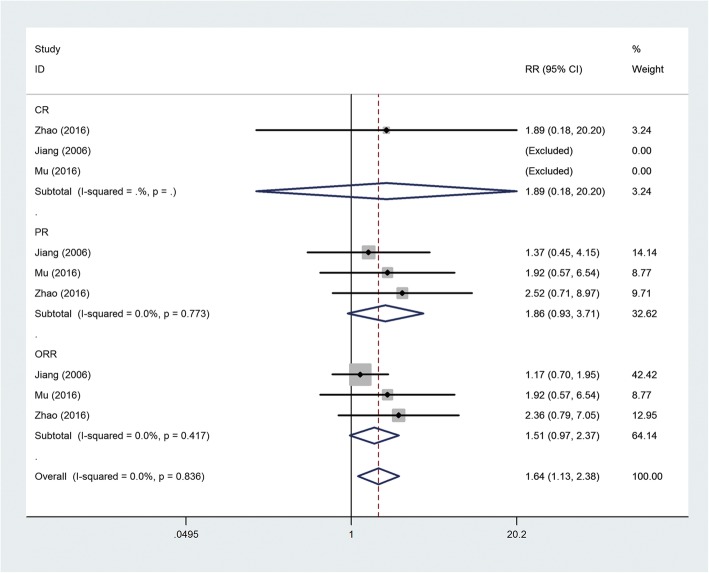 Forest plot of the comparison of complete response (CR), partial response (PR), and overall response rate (ORR)