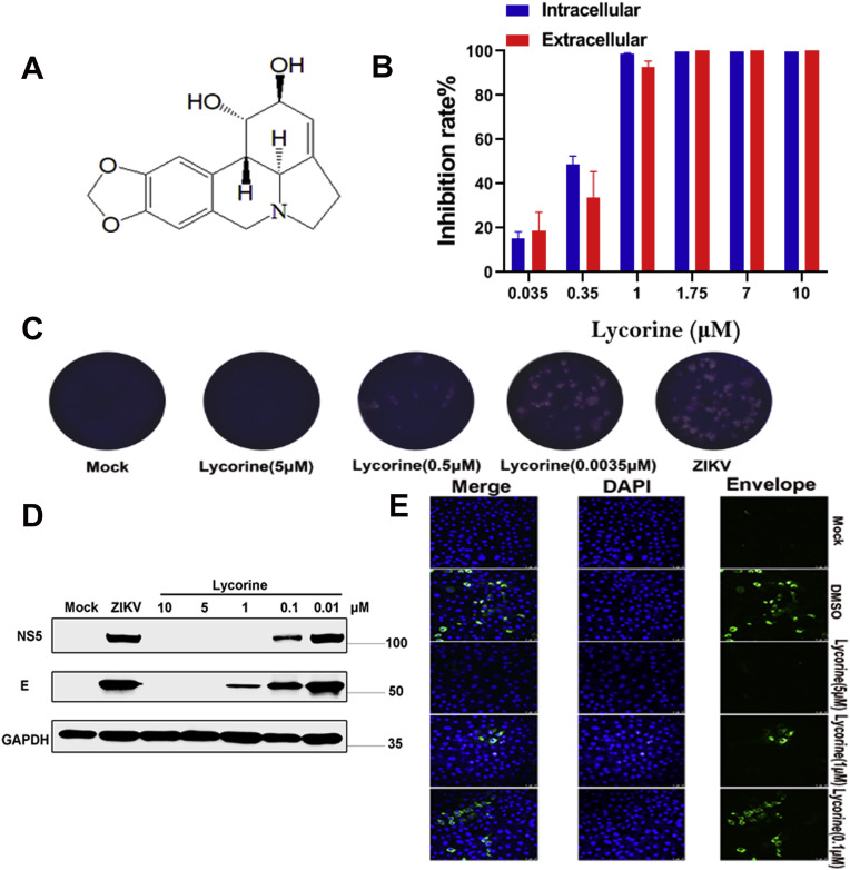 Dose-dependent inhibition of ZIKV infection by lycorine. (A) The structure of lycorine. (B) Lycorine inhibition of intracellular RNA formation was determined by qRT-PCR, and extracellular virion release was determined by the plaque forming assay. (C) Lycorine inhibition of plaque formation was determined by the plaque forming assay. (D) After ZIKV infection, Vero cells were treated with different concentrations of lycorine and viral protein was detected by Westernwestern blotting. (E) The antiviral activity of lycorine against ZIKV was determined by an immnofluorescence assay. Cell nuclei were stained with DAPI (blue). Envelope protein was immunostained with an anti-panflavivirus envelope monoclonal antibody (4G2). The envelope protein is indicated in green. . (For interpretation of the references to colour in this figure legend, the reader is referred to the Web version of this article.)