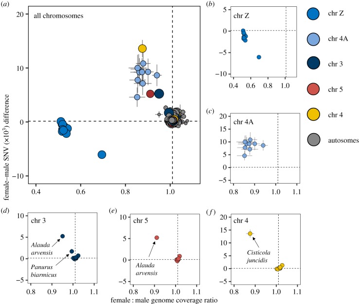 Mean (±s.e.) female-to-male read coverage ratio and female-to-male difference in number of SNVs for each chromosome in 10 species belonging to 10 different Sylvioidea families. Chromosomes identified as sex-linked in any of the studied species (chromosomes Z, 4A, 3, 5 and 4) are coloured differently from the other chromosomes. The sizes of the dots correspond to chromosome length, and the dashed lines mark the median based on all chromosomes in all species. (a) All chromosomes in all 10 species (i.e. 10 dots for each chromosome). (b–f) Chromosomes identified as sex-linked in at least one species shown separately. (b) Chromosome Z and (c) chromosome 4A are sex-linked in all studied species. (d) Chromosome 3 is sex-linked in Alauda arvensis (Alaudidae) and Panurus biarmicus (Panuridae) and (e) chromosome 5 in A. arvensis, as reported previously [15]. (f) Chromosome 4 is sex-linked in Cisticola juncidis (Cisticolidae) but not the other species, which is a novel finding for this study.