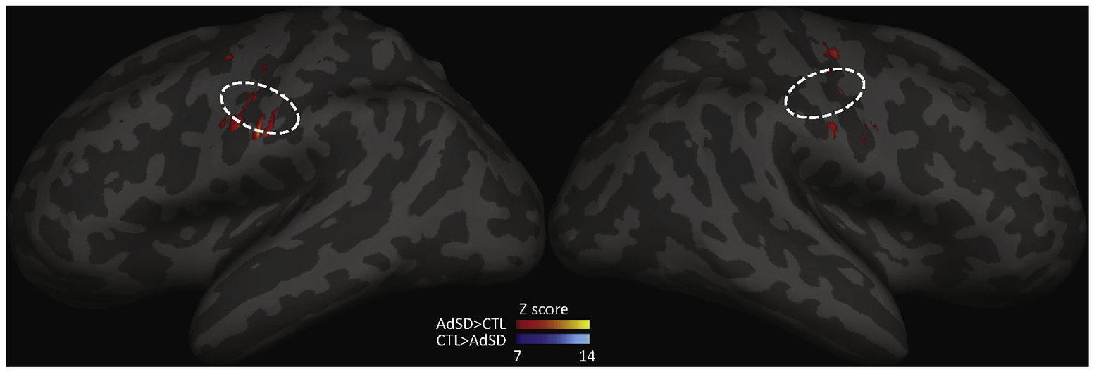Between group comparisons of fMRI BOLD activation in M1 during phonation. Dashed lines (projection of a circle with a radius of 5mm): estimated LMC area projection on inflated brain surface. Warm colors represent AdSD>CTL, cool colors represent CTL>AdSD. Results indicate greater activation in AdSD vs CTL in LMC area, particularly in the left hemisphere.