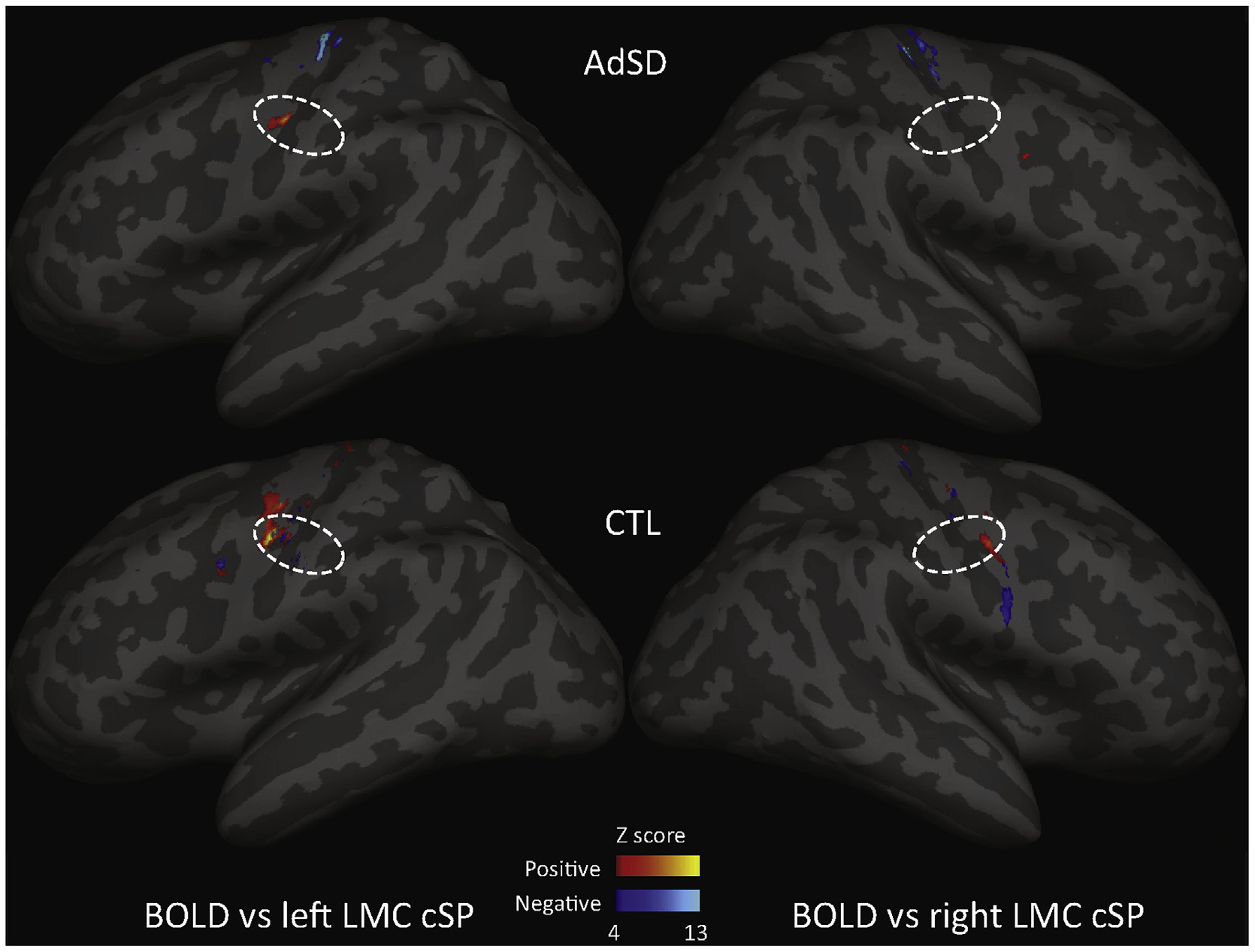 This work evaluated the cSP of the LMC and the relationship between cSP and functional magnetic resonance imaging (fMRI) blood-oxygen-level dependent (BOLD) activation in people with AdSD (n = 12) compared to healthy controls (CTL, n = 14).