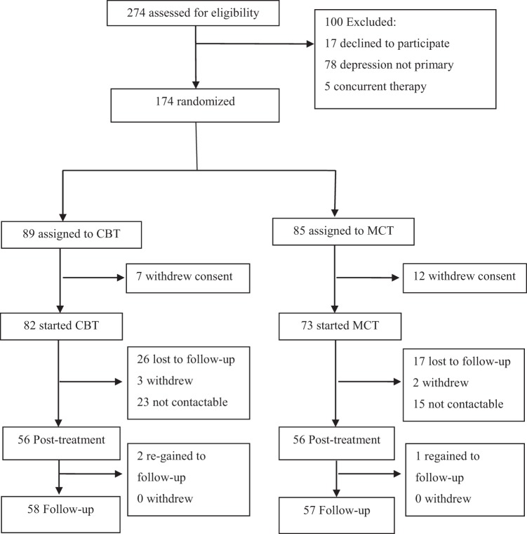 A total of 274 patients were assessed for study suitability following referral to the clinic for depression symptoms, of these 100 were excluded. Reasons for exclusion were as follows: 17 declined to participate, in 78 depression was not primary, 5 were receiving concurrent therapy. 174 were randomized, 89 to CBT and 85 to MCT, but 7 and 12 of these respectively withdrew consent (including use of their baseline data) after randomization. The remaining 155 patients (82 assigned to CBT and 73 assigned to MCT) participated in the trial (Fig. 1).