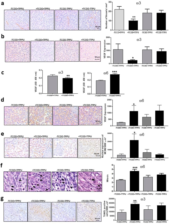 Opposite to its effect in mice fed the high ω3 diet, TCDD accelerated the growth of LLC-derived tumors in male mice fed the high ω6 diet 21 when they were treated with TPPU (Fig. 4b).