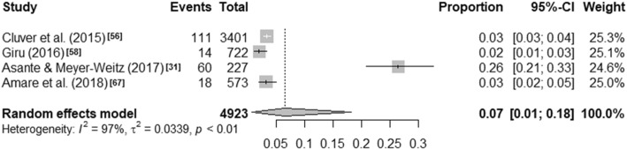 Fifty-five (74·3%) of the studies reported prevalence estimates, though none reported lifetime, 12-month, 6-month, and 1-month estimates, with 12-month estimates favoured by the majority (n = 30; 54·5%). As shown in Table 2, the reported lifetime prevalence estimates ranged from 1·4% to 48·3% [28, 50]; the 12-month prevalence estimates varied between 0·9% and 35·8% [52, 72]; the reported 6-month prevalence ranged from 7·4% to 22·7% [55, 79]; and the 1-month reported prevalence estimates varied between 1·9% and 26·4% [31, 58].
