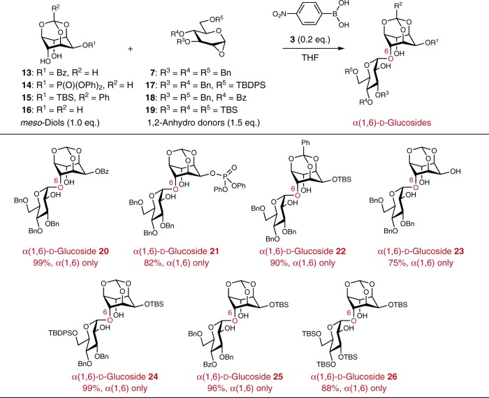 The effect of protecting groups of the meso-diol using 13–15 was also examined (Fig. 3). The corresponding α(1,6)-d-glucosides 20–22 were obtained as single isomers in high yields (Supplementary Figs. 2, 4, and 9–12, Supplementary Tables 4–9). In addition, even when triol 16 possessing a more reactive hydroxyl group at 2 position was used, α(1,6)-d-glucoside 23 was obtained with excellent diastereoselectivity (Supplementary Tables 10 and 11). This result indicated that the activation of 4,6-diol by the boronate ester formation was more important for the glycosylation than the innate reactivity of hydroxyl group. Next, the effect of protecting groups of the glycosyl donor using 17–19 (synthesis of 18 was described in Supplementary Fig. 1) was examined. In these cases, also, the desymmetric glycosylations proceeded effectively to give the corresponding α(1,6)-d-glucosides 24–26 with high regio- and 1,2-cis-stereoselectivities in high yields (Supplementary Figs. 2, 5, and 13–15, Supplementary Tables 12–17). These results clearly indicated that the regioselectivity of the present glycosylations was not affected by the protecting groups.