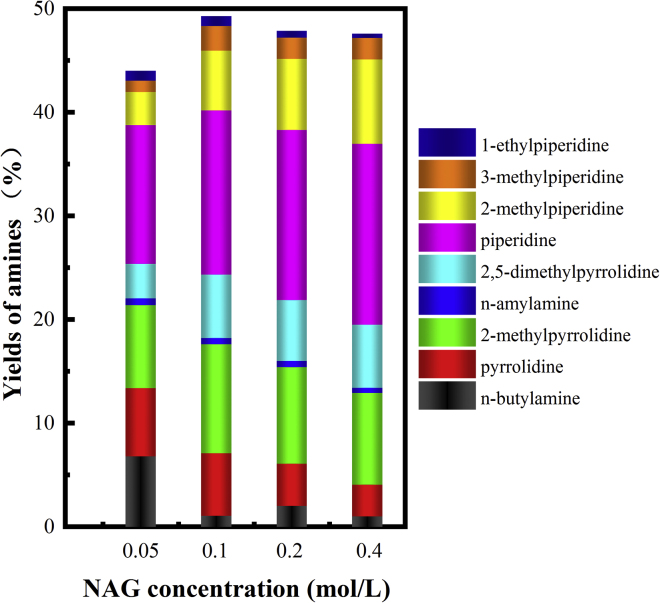 The effects of the NAG concentration are illustrated in Figure 8. Low yields of amines were obtained if the NAG concentration was 0.05 mol/L, which indicates that the amines might undergo a further decomposition. The higher contents of the n-butylamine and pyrrolidine were the evidence for the C-C bond cleavage. However, increasing the NAG concentration to 0.2 and 0.4 mol/L resulted in similar yields of amine as 0.1 mol/L NAG did. Similar to the effect of the acid loading, increasing the NAG concentration was more favorable for the formation of the piperidine derivatives with the six-carbon member ring structure instead of pyrrolidine or 2-methylpyrrolidine with less carbon numbers, which further verified that the amines were more readily decomposed at lower NAG concentrations. However, the highest yields of amines were still obtained when the NAG concentration was 0.1 mol/L.