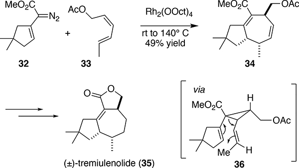 During the studies of the reactions with dienes we learned that donor/acceptor carbenes unexpectedly displayed demanding steric effects. The regiochemistry of the formal [4+3] cycloaddition depends on which double bond of the diene is cyclopropanated.20a An unsubstituted double bond is easily cyclopropanated as well as an internally substituted double bond. A cis disubstituted double bond is less reactive than a mono-substituted double bond, whereas reaction at a trans double bond is considerably less favorable. An example, illustrating the significance of the steric effect, was seen in the reaction of the cyclopentenyldiazoacetate 32 the (E,Z)-hexadiene 33, which generated the cycloheptadiene 34 as a key step in the synthesis of (±)-tremulenolide (35) (Scheme 8).28 The reaction proceeds via the intermediacy of the divinylcyclopropane 36 in which the cis alkene has been cyclopropanated selectively, setting up both the high regiocontrol and diastereocontrol of the reaction. The high regioselectivity observed with these donor/acceptor carbenes is far more pronounced than what is typically seen in rhodium catalyzed cyclopropanations with the acceptor carbene derived from ethyl diazoacetate.