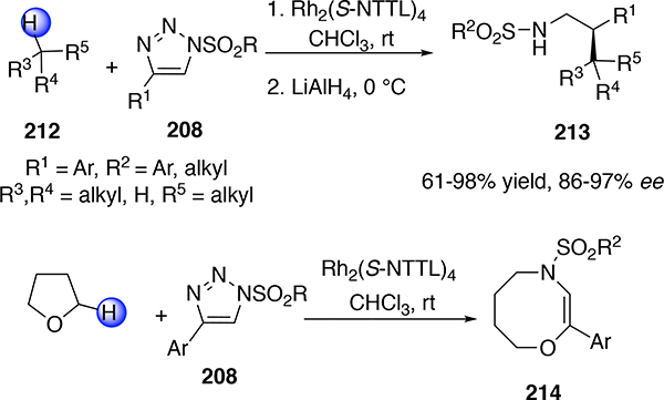 - (94).(a) Kubiak RW; Mighion JD; Wilkerson-Hill SM; Alford JS; Yoshidomi T; Davies HML, Enantioselective Intermolecular C-H Functionalization of Allylic and Benzylic sp3 C-H Bonds Using N-Sulfonyl-1,2,3-triazoles. Org. Lett 2016, 18, 3118–3121; [DOI] [PMC free article] [PubMed] [Google Scholar]; (b) Kubiak RW; Davies HML, Rhodium-Catalyzed Intermolecular C-H Functionalization as a Key Step in the Synthesis of Complex Stereodefined β-Arylpyrrolidines. Org. Lett 2018, 20, 3771–3775. [DOI] [PMC free article] [PubMed] [Google Scholar]