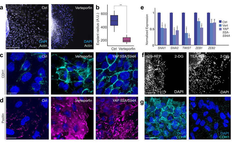 (a-b) Inhibition of YAP1-TEAD1 interaction with Verteporfin inhibits neural crest migration and results in smaller neural crest explants. (c-d) Images of CDH1 and Paxillin staining in control, Verteporfin treated and dominant negative YAP 5SA-S94A transfected neural crest explants, show retention of epithelial features following inhibition of Yap/Tead signaling.(e) qPCR for EMT transcription factors following pharmacological (Vert) and competitive inhibition (mutant YAP5SA-S94A construct) of YAP1-TEAD1 interaction in neural crest cells.(f) Expression of TEA-VPR construct that mimics constitutively active TEAD1, rescues phenotypes of glycolytic inhibition. DAPI staining of control and TEA-VPR overexpressing explants treated with 2-DG. (g) Immunofluorescence for CDH1 shows successful EMT in TEA-VPR expressing explants, even in the presence of 2-DG. Error bars represents ± S.E.M.Scale bar : 200um (a,f), 35um (c-d,g). Also see Fig. S6.