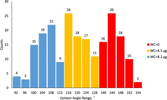 Histogram of contact angles for hydrophobic glass bead surface at different water content.