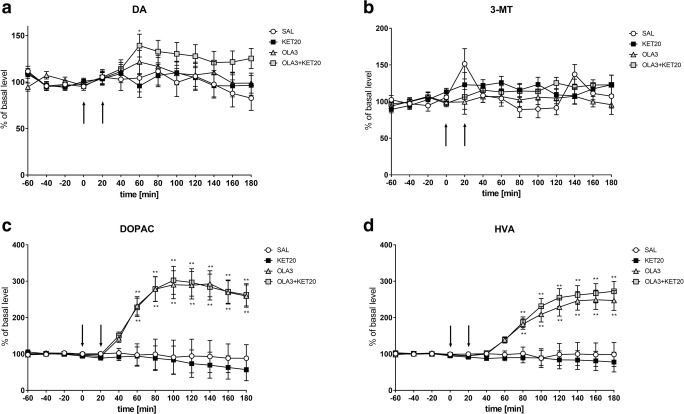 The same analysis demonstrated a significant effect of treatment on the HVA concentration (F[3,18] = 12.23; p < 0.01), the effect of TIME (F[12,216] = 27.6; p < 0.01) and the interaction between TIME and treatment (F[36,216] = 12.04; p < 0.01). Duncan’s test demonstrated that both a single dose of olanzapine and combined ketamine and olanzapine treatment significantly increased HVA levels (approx. 250%) (Fig. 9d), while ketamine alone did not change this parameter (Fig. 9d).