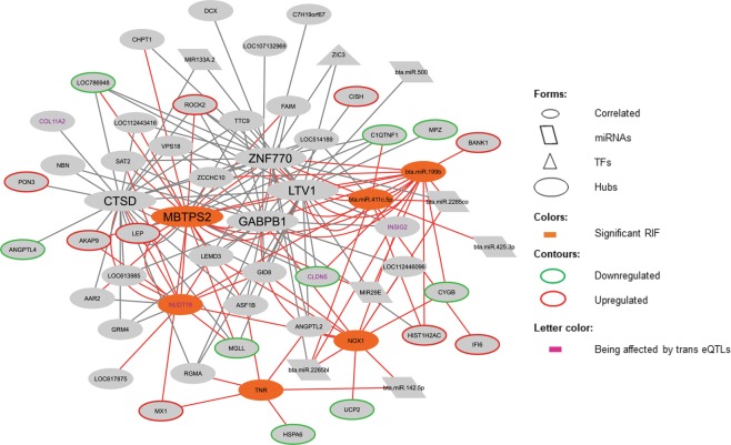 To identify the elements putatively regulating the genes being part of over-represented pathways in the study, we did another round of PCIT15 analyses, separately for each mineral. In this case, from the last PCIT analysis by mineral, we selected as inputs the genes being part of enriched pathways, also considering the previously enriched pathways from differentially expressed genes related to mineral amount9,10, the hub elements, TFs17, miRNAs and the ones with significant RIFs, with their respective attributes. The PCIT15 results were used to obtain co-expression networks with Cytoscape78 software.