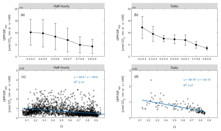 Dependence of canopy GPP/SIF760 on the clearness index (CI) averaged at 0.1 intervals (a,b) in the DM maize field for the training dataset. Half-hourly data with CI < 0.3 and daily data with CI < 0.2 were excluded from the analysis. The linear correlations between CI and GPP/SIF760 are based on the half-hourly mean data (c) and daily mean data (d), respectively. Error bars indicate from the mean.