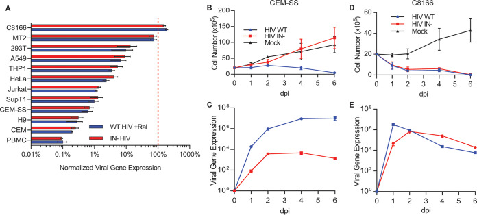 Differential gene expression and replication of integrase-deficient (IN−) HIV-1. (A) Nano luciferase (NLuc) activity from the indicated cell lines or activated peripheral blood mononuclear cells (PBMCs) infected with the wild type (WT), WT plus raltegravir (RAL), or with the D64V integrase mutant (IN−) NL4-3-based indicator virus in which the nef gene was replaced with the NLuc indicator gene (NL-NLuc) reporter virus at 48 hours postinfection (hpi). The cells used express CD4 naturally or artificially. NLuc expression levels were normalized to WT, set at 100%. n = 3, ± standard deviation (SD). Viable cell counts of (B) CEM-SS and (D) C8166 cells infected with WT or IN− forms of the replication-competent NL-NLuc indicator virus. Virally encoded NLuc expression was measured for (C) CEM-SS and (E) C8166 cells infected with WT or IN− NL-NLuc. All IN− infections shown in panels B to E were conducted in the additional presence of 20 μM RAL.