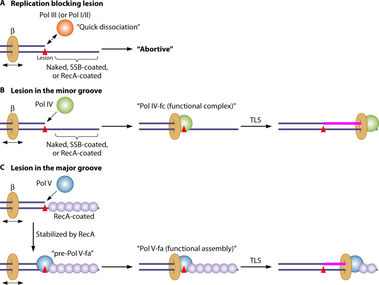 Stochastic access of DNA Pols on lesion-containing template DNA. Functional TLS requires a proper lesion-Pol combination. (A) We discuss only the case of a lesion that cannot be bypassed by high-fidelity Pols (i.e., Pol I to III). However, these Pols occasionally get involved in nonproductive degradation/resynthesis cycles at primer ends in the vicinity of lesions (65). (B) For a minor groove lesion, Pol IV following interaction with the β-clamp (i.e., Pol IV functional complex [Pol IV-fc]) bypasses the lesion in any stage of the SOS response. (C) For a major groove lesion, during the late SOS response, Pol V is stabilized by RecA, leading to the formation of a pre-Pol V-fa complex (Pol V with RecA*), followed by interaction with the β-clamp (Pol V functional assembly [Pol V-fa]), subsequently bypassing the lesion.