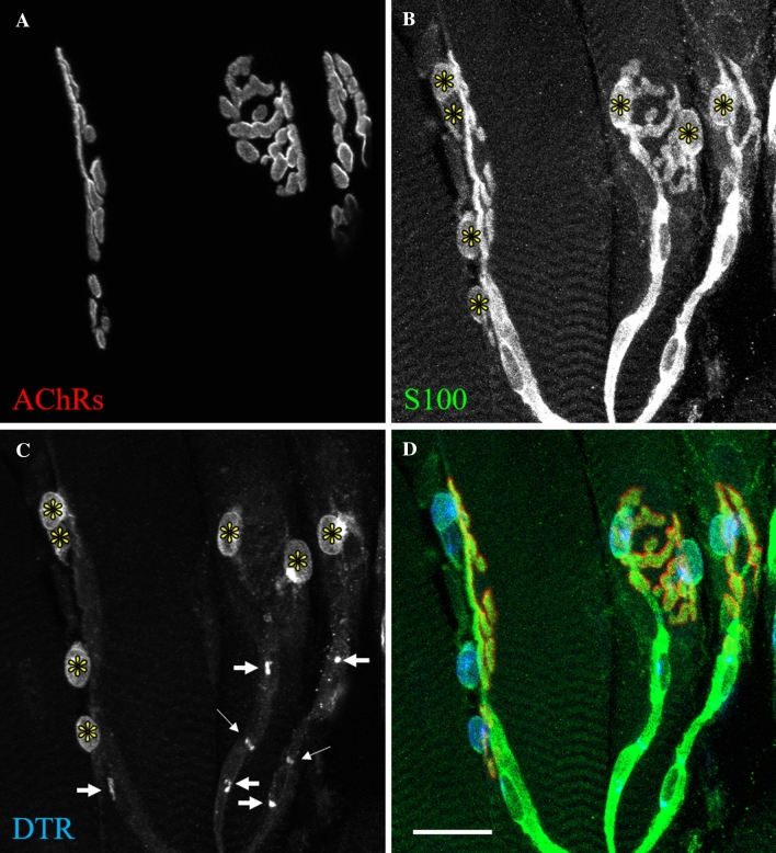 The plp1-CreERT transgene preferentially drives expression of DTR in tSCs at the NMJ. Young adult NMJs expressing plp1-CreERT and DTR transgenes were stained with BTX to label AChRs (A) and for S100 to label tSCs (asterisks) and myelinating SCs (B). DTR stain is robust in the soma of each tSC (asterisks), but weak in their processes (C). In myelinating SCs, DTR stain seems to be concentrated in paranodal microvilli (thin arrows, C) and in small spots in each nucleus (thick arrows, C). (D) Composite image of A–C. Fiji and Microsoft Powerpoint were used to generate this figure. Scale bar 20 µm.