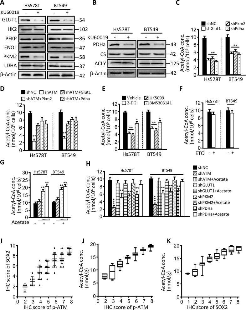 a, b Western blotting show the glycolysis-related (a) and TCA-cycle-related (b) gene expressions in mammospheres derived from Hs578T and BT549 cells under treatment with or without KU60019 (10 µM) and from ATM-silenced cells in hypoxia. c–h Acetyl-CoA productions of the indicated mammospheres were determined. c Knockdown of GLUT1, PKM2, or PDHa and the control mammospheres. d Ectopic GLUT1, PKM2, or PDHa was transfected into hypoxic mammospheres with ATM knocked down. e Mammospheres treated with or without 2-deoxyglucose (2-DG, 5 mM), UK5099 (an inhibitor of the mitochondrial pyruvate carrier (MPC), 10 μM), or BMS303141 (an inhibitor of ACLY, 20 μM); f mammospheres treated with or without Etomoxir (ETO, an inhibitor of CPT1, 20 μM); g exogenous addition with or without acetate (1, 5, or 10 mM). h Exogenous addition with or without acetate (10 mM) in mammospheres under ATM, GLUT1, PKM2, or PDHa knocked down. i, j A positive correlation between p-ATM and SOX2 protein levels (i), p-ATM and production of acetyl-CoA (j), and SOX2 protein expression and acetyl-CoA (k) in 92 clinical breast cancer samples (*P < 0.05; **P < 0.01).